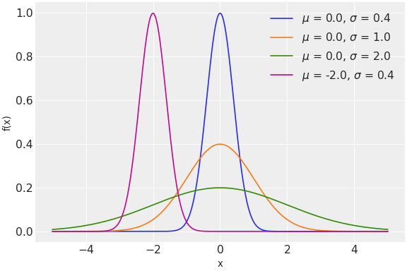 \[f(x \mid \mu, \tau) = \sqrt{\frac{\tau}{2\pi}} \exp\left\{ -\frac{\tau}{2} (x-\mu)^2 \right\}\]