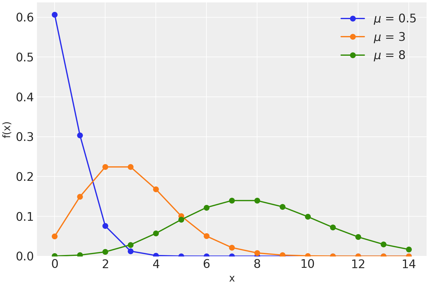 \[f(x \mid \mu) = \frac{e^{-\mu}\mu^x}{x!}\](